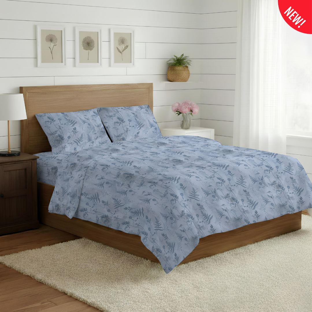 Un soffio di natura avvolge il tuo riposo con questa raffinata fantasia floreale ispirata alla delicata botanica di campo. La collezione si declina nelle rilassanti tonalità del beige, del verde e dell’azzurro, offrendo un’estetica fresca e sofisticata che trasforma la camera da letto in un giardino incantato.