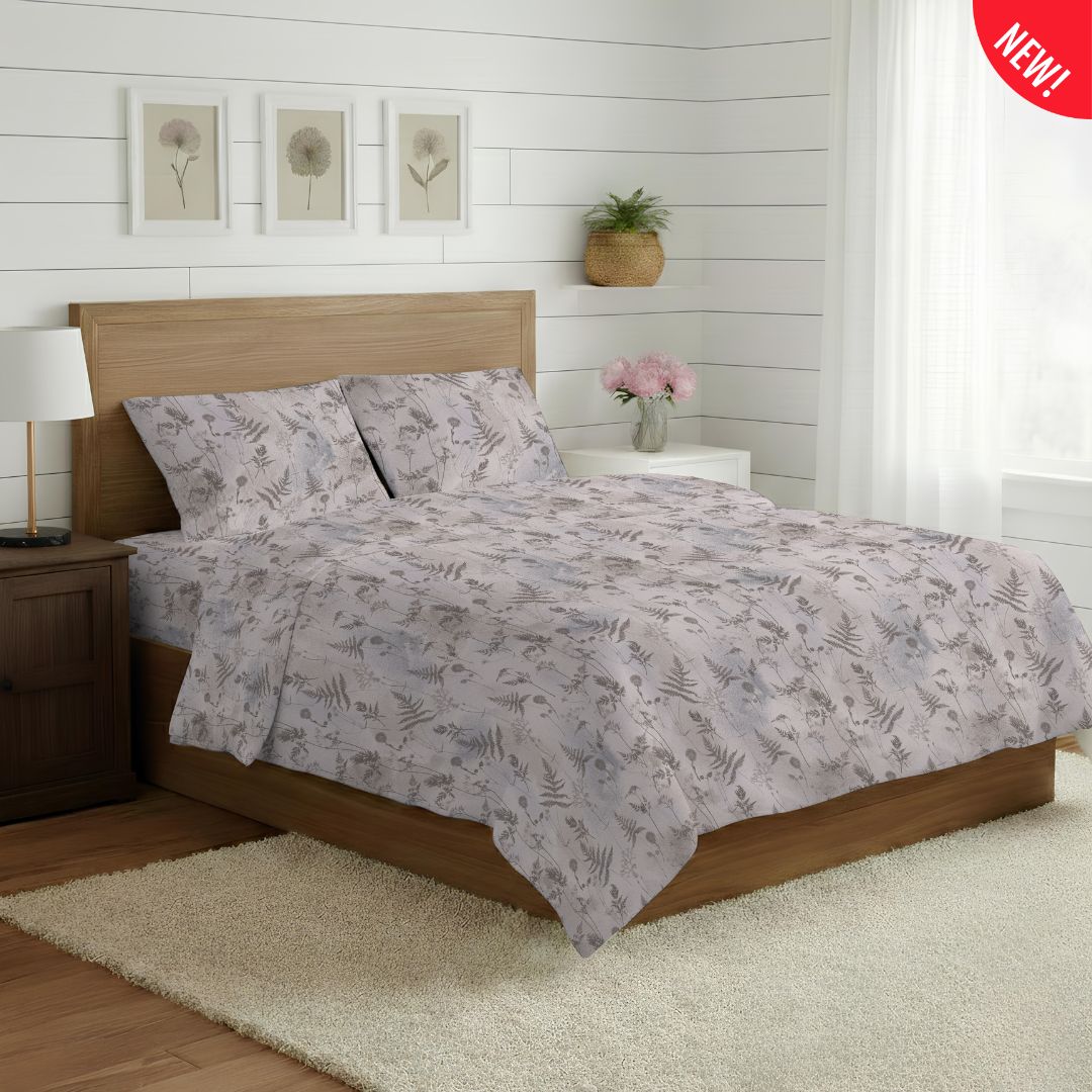 Un soffio di natura avvolge il tuo riposo con questa raffinata fantasia floreale ispirata alla delicata botanica di campo. La collezione si declina nelle rilassanti tonalità del beige, del verde e dell’azzurro, offrendo un’estetica fresca e sofisticata che trasforma la camera da letto in un giardino incantato.