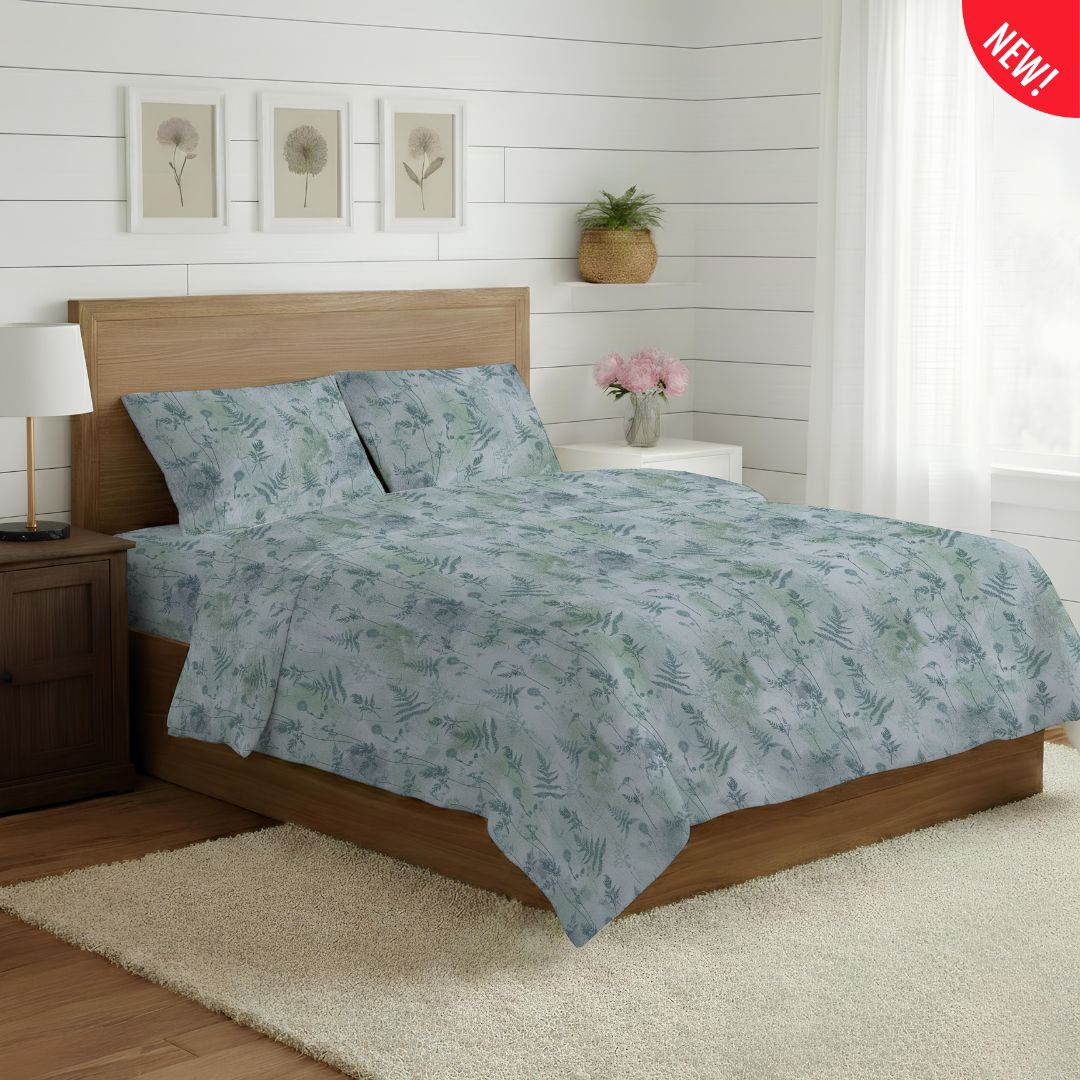 Un soffio di natura avvolge il tuo riposo con questa raffinata fantasia floreale ispirata alla delicata botanica di campo. La collezione si declina nelle rilassanti tonalità del beige, del verde e dell’azzurro, offrendo un’estetica fresca e sofisticata che trasforma la camera da letto in un giardino incantato.
