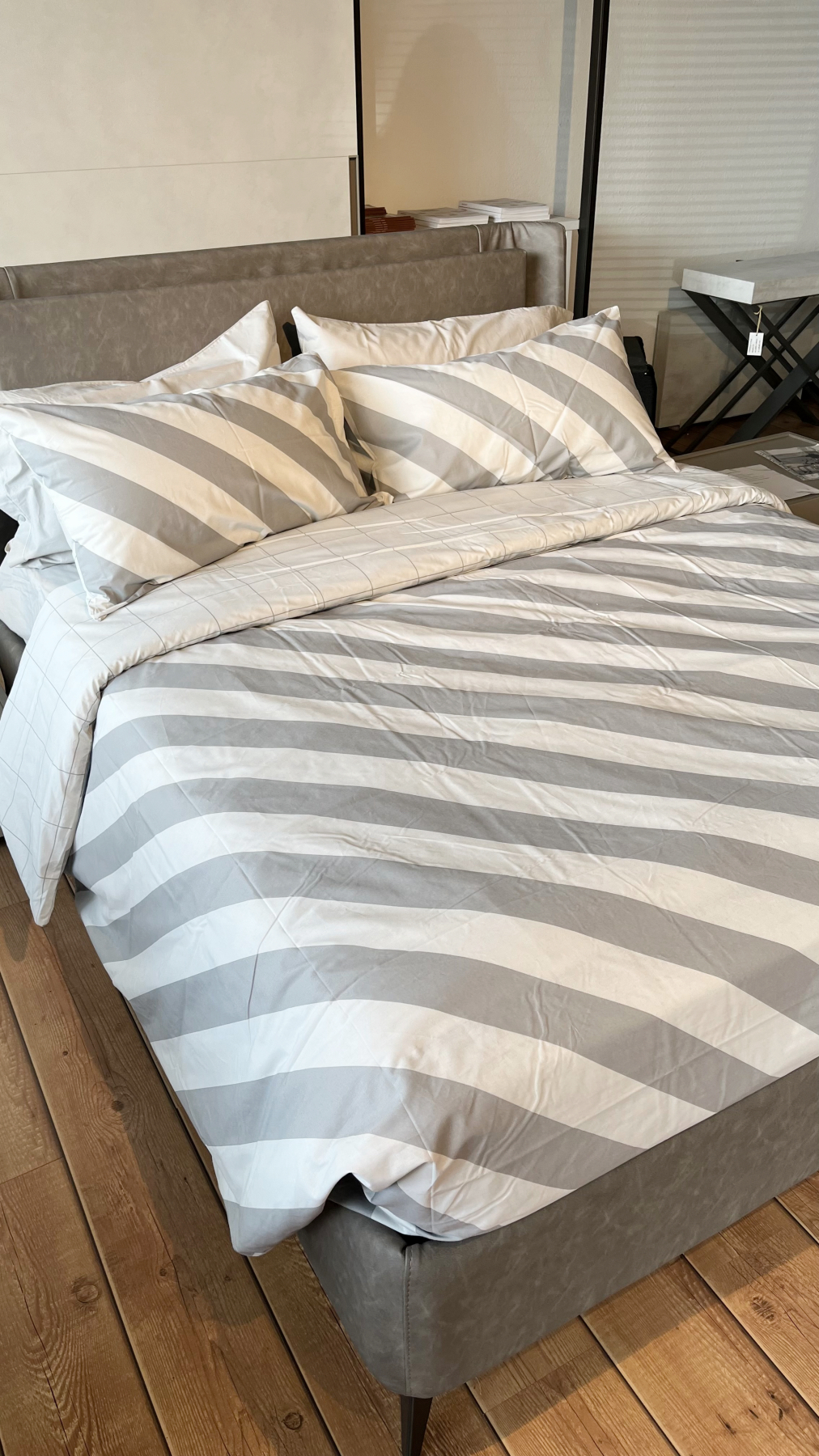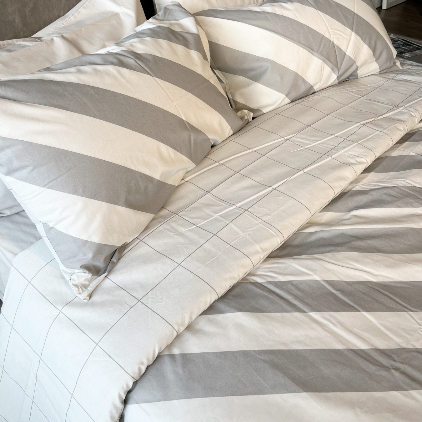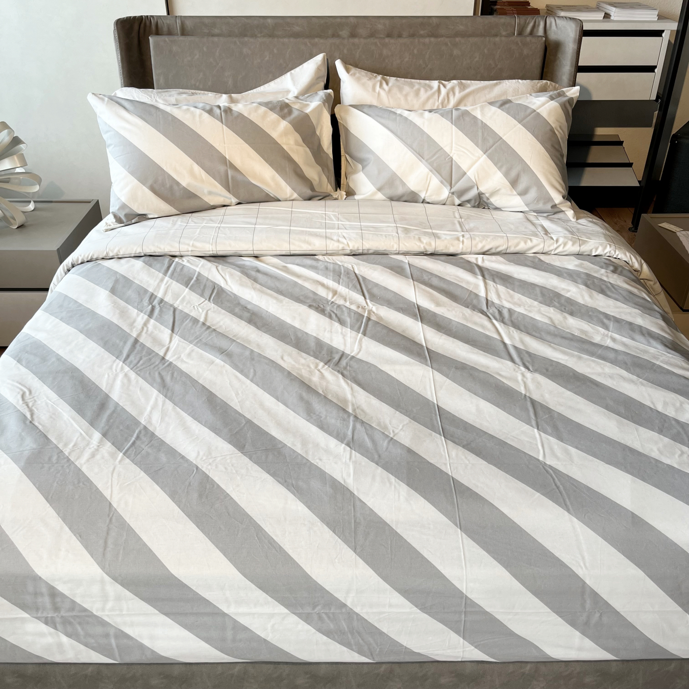 Un lato presenta ampie fasce diagonali color grigio, mentre il rovescio propone una raffinata trama a quadri, permettendoti di rinnovare il look della camera in un attimo.