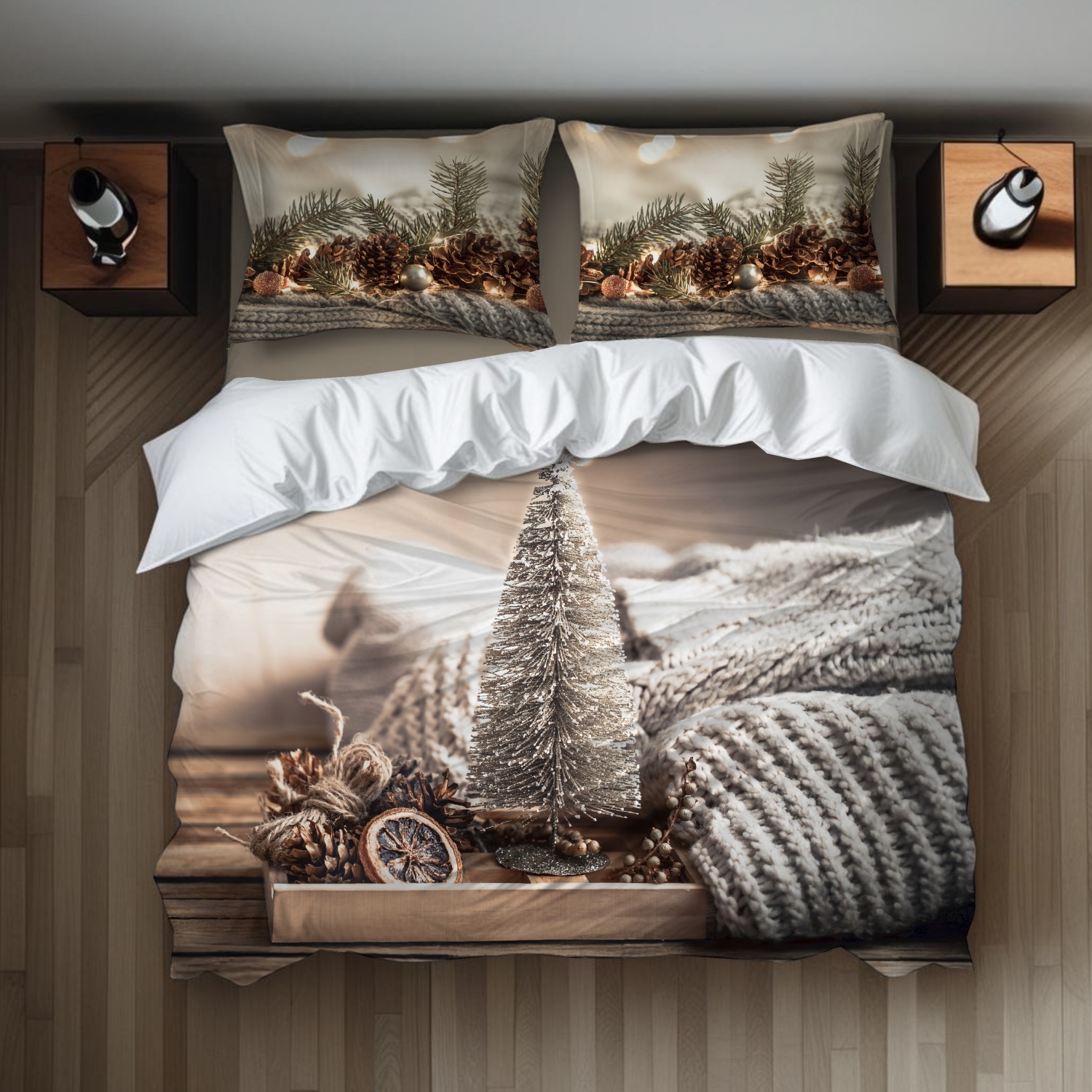 La fantasia di questo copripiumino cattura un’atmosfera natalizia e accogliente con un tocco rustico e naturale.