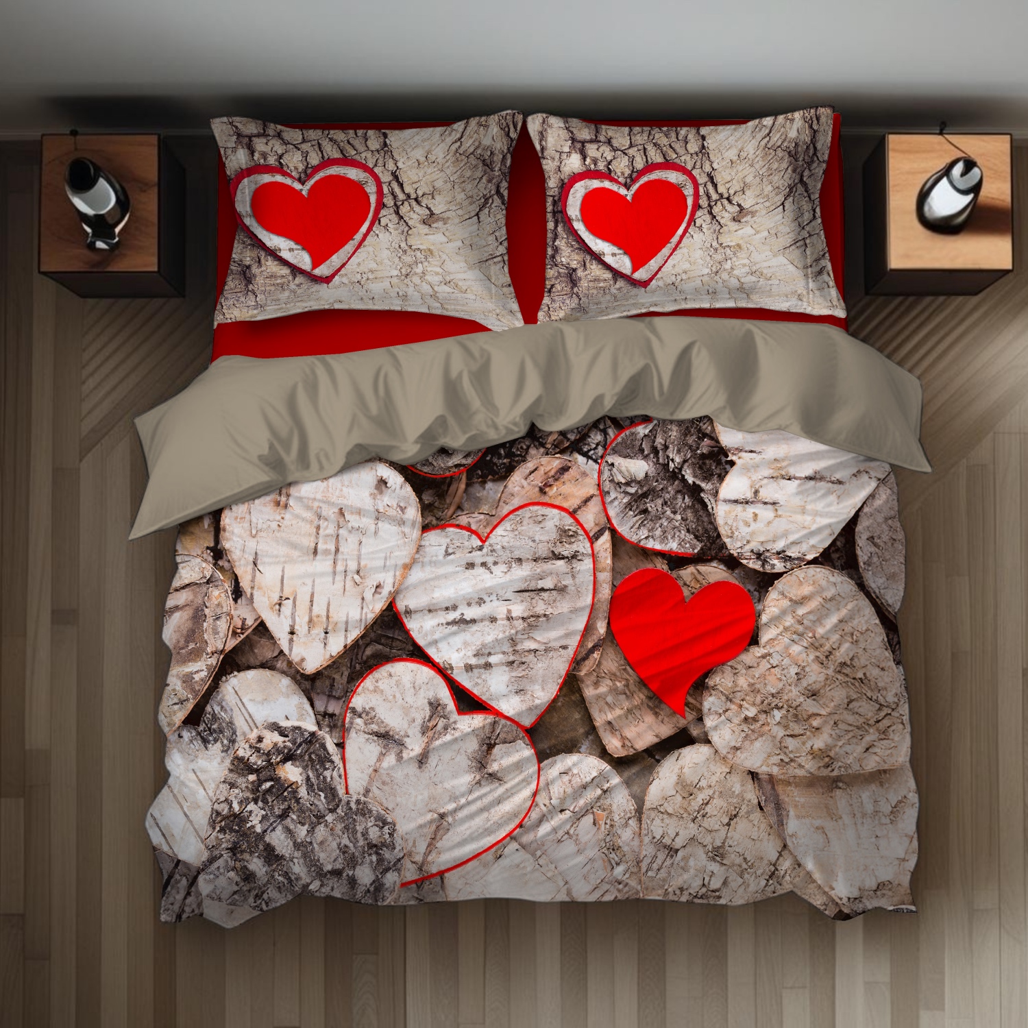 La stampa principale mostra un insieme di tronchi e legni con la loro corteccia chiara e irregolare. Tra questi, spiccano diversi cuori, alcuni ricavati dal legno stesso, altri in un acceso colore rosso, che creano un forte contrasto visivo. L’immagine evoca un senso di artigianalità e calore, come se i cuori fossero stati intagliati nel legno.